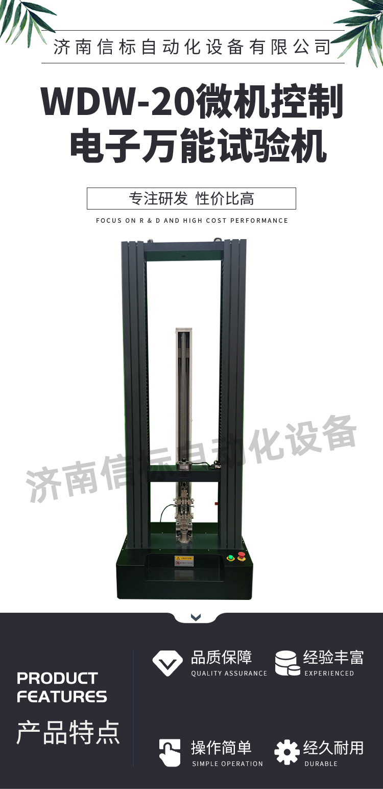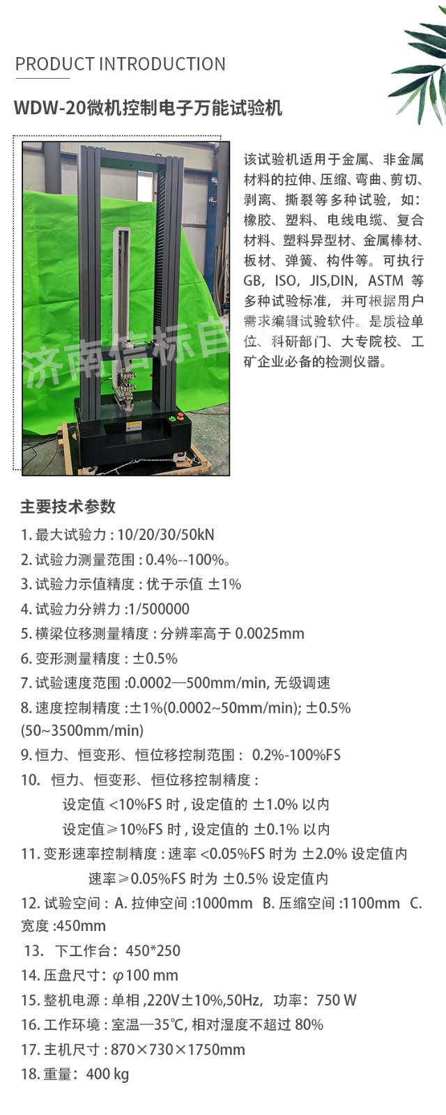 測量參數: 1. 最大試驗力: 10/20/30/50kN 2. 試驗力測量范圍: 0.4%--100%。 3. 試驗力示值精度:優于示值±1% 4. 試驗力分辨力:1/500000 5. 橫梁位移測量精度:分辨率高于0.0025mm 6. 變形測量精度: ±0.5% 7. 試驗速度范圍:0.0002—500mm/min,無級調速 8. 速度控制精度:±1%(0.0002~50mm/min); ±0.5%(50~3500mm/min) 9. 恒力、恒變形、恒位移控制范圍: 0.2%-100%FS 10.恒力、恒變形、恒位移控制精度: 設定值<10%FS時,設定值的±1.0%以內 設定值≥10%FS時,設定值的±0.1%以內 11. 變形速率控制精度: 速率<0.05%FS時為±2.0%設定值內 速率≥0.05%FS時為±0.5%設定值內 12. 試驗空間: A.拉伸空間:1000mm B.壓縮空間:1100mm C.寬度:450mm 13.下工作臺:450*250 14. 壓盤尺寸:φ100 mm 15. 整機電源:單相,220V±10%,50Hz,功率:750 W 16. 工作環境:室溫—35℃,相對濕度不超過80% 17. 主機尺寸: 870×730×1750mm 18. 重量:400 kg 三、產品配置: 1、主機 一套 2、松下A7全數字伺服電機及伺服驅動器; 一套 3、高精度負荷傳感器; 5kn/1kn/500N/200/ 各一支 4、Hiwin精密滾珠絲杠; 2支 5、光電編碼器(2500線,內置); 1支 6、夾具:滿足海綿/汽車座椅所需工裝 1套(有多種) 7、三閉環測量系統一套,采用力,位移,應變等多種控制方式,試驗過程中可實時顯示力-位移,力-時間,應力-應變等多種試驗曲線,并可自動得出最大負荷,拉伸強度,斷裂伸長率等多種結果參數。 8、HP品牌計算機,21寸液晶顯示器; 9、打印機:HPA4彩色噴墨打印機; 10、專用試驗軟件:可執行GB,ISO,JIS、DIN,ASTM等多種試驗標準,全開放式,功能強大,方便操作,免費提供升級軟件,并可根據用戶需求自行編輯試驗軟件。