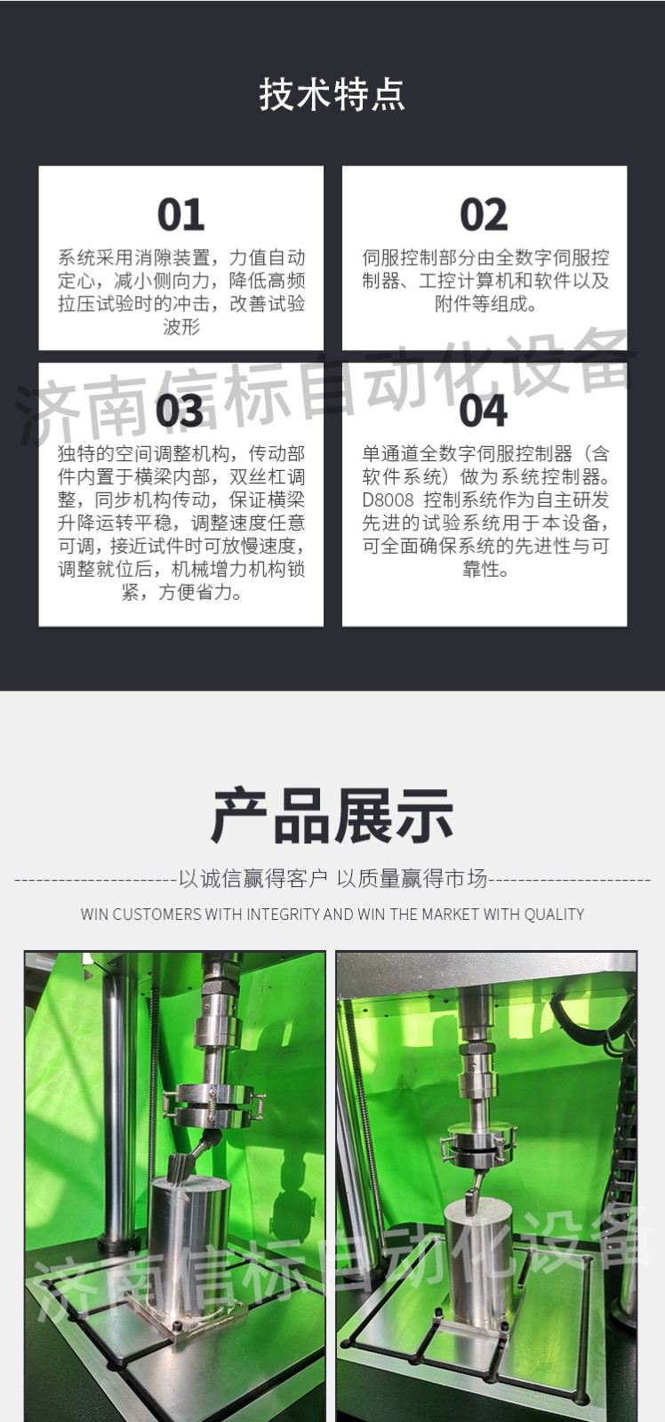 濟南信標自動化設備有限公司主要生產(chǎn):動靜態(tài)萬能疲勞試驗機,接骨板彎曲試驗機,縫合線拉伸疲勞試驗機,髖膝關(guān)節(jié)磨損試驗機,電子萬能試驗機、液壓萬能試驗機、巖石三軸、四軸,電液拉力試驗機,材料試驗機,高低溫蠕變,高低頻疲勞,拉伸、扭轉(zhuǎn)、杯突等二十多個系列兩千多個的品種。